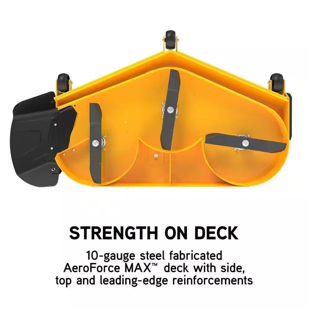 • 60 in. aeroforce maximum 10-Gauge reinforced fabricated steel cutting deck with low maintenance spindles, smooth arc triple-blades, cut overlap and deep dome deck design that is built to provide flawless results, mows a wide area of grass to help minimize cutting time and provides your lawn with a clean, premium cut