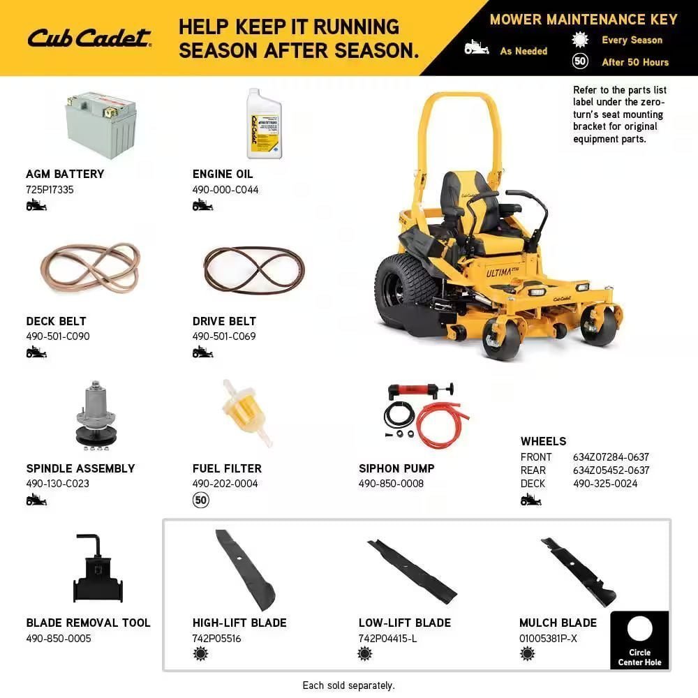 The Ultima Series ZTX5 60 is another step up in the Cub Cadet ultimate mowing experience, built to raise the bar for strength without sacrificing operator comfort and packed with commercial-grade features. Starting with the robotically welded 10-Gauge AeroForce maximum fabricated steel deck with side, top and tough reinforcements engineered for excellent airflow, to help clippings move through the deck cleanly and efficiently providing exceptional bagging performance that was specifically designed to prevent clumping and blockage. Designed to ride in comfort with a large 24 in. high back seat with cushioned armrests, comfortably designed lap bars, spring-assist deck lift and rubber floor mat allow you to efficiently cut at your maximum speed up to 8 MPH. The 1.5 in. x 3 in. tubular steel frame provide strength and rigidity while an open frame design provides optimal leg room and a hinged/removable floor pan allows quick and easy access to the deck and engine for ease of maintenance. Ideal for mowing slight rolling hills and several obstacles from 4- to 12-acres. Backed by a 4-year/800-hour limited product warranty.