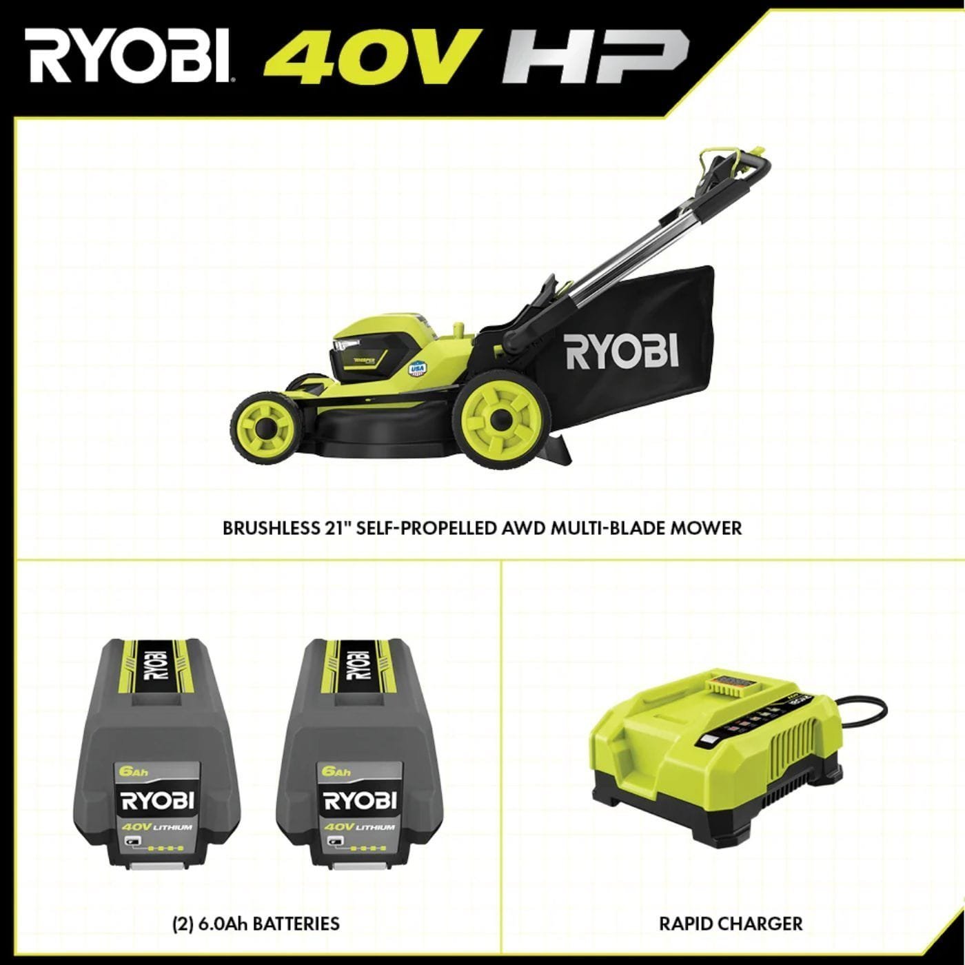 Meet the RYOBI 40V HP Brushless Whisper Series 21″ Walk Behind Self-Propelled All Wheel Drive Lawn Mower, a powerful and efficient gas replacement that’s perfect for lawns up to ¾ acre. With its CROSS CUT Multi-Blade System, you’ll get superior cutting and even clippings dispersal. The brushless motor and advanced electronics work together to ensure a smooth, consistent cut, and the Whisper Series technology makes it 85% quieter than gas mowers. This mower also features a convenient storage design and is part of the 40V System, making it easy to expand your RYOBI collection.