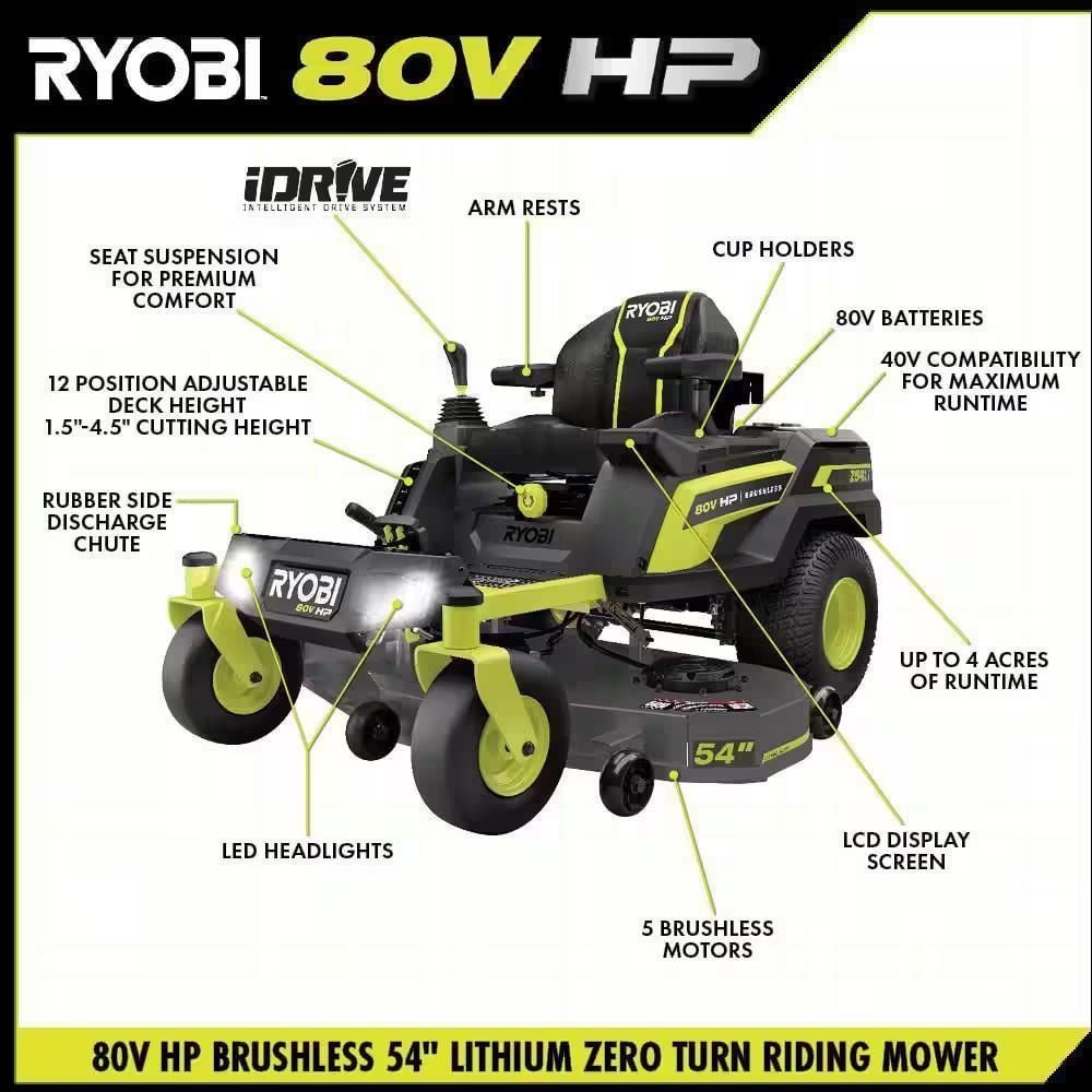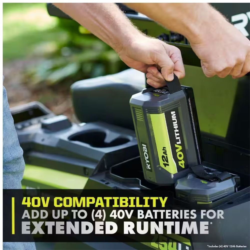 • Zero Turn Mower: Compatible with the RYOBI 40V platform of over 75 40V products, allowing you to use the included two 40V 12 Ah batteries to extend your runtime