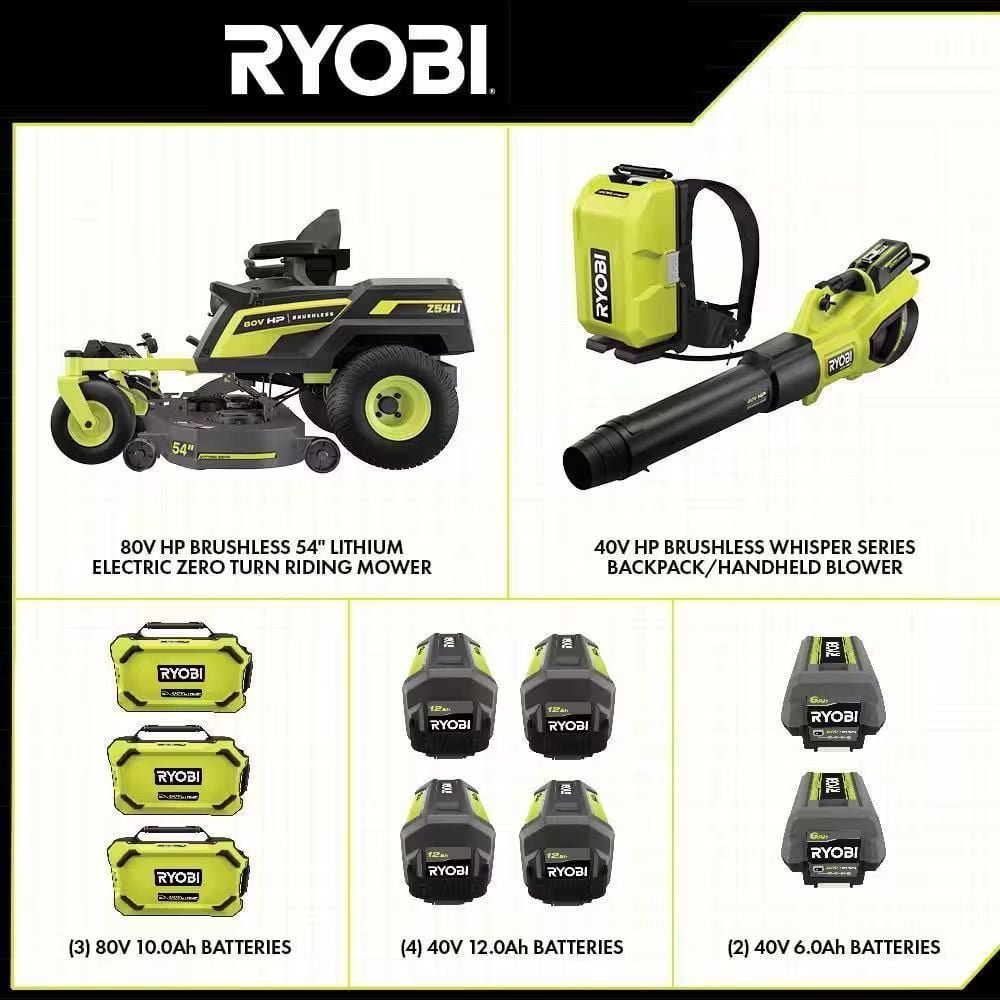 • Included: 80V HP 54 in. Zero Turn Mower, 40V HP Backpack Battery, 40V HP Blower, (3) 80V Batteries, (4) 40V 12 Ah Batteries, (2) 40V 6 Ah Batteries, 80V Super Charger