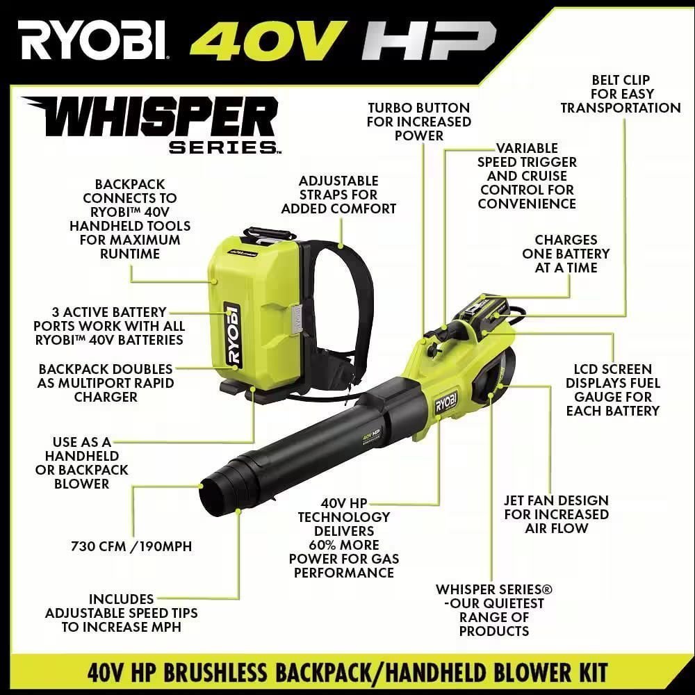• 40V Backpack Battery: 3 active battery ports work with all RYOBI 40V batteries